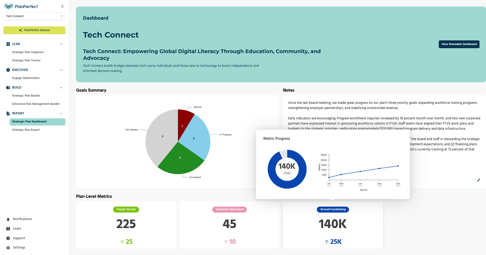 Impact-measuring tracking and reporting tools build better employee teams, boards, and donor relationships to help your nonprofit succeed. PlanPerfect's dashboard features make tracking and reporting on strategic plan goals and objectives simple, so you can focus on fulfilling your mission.