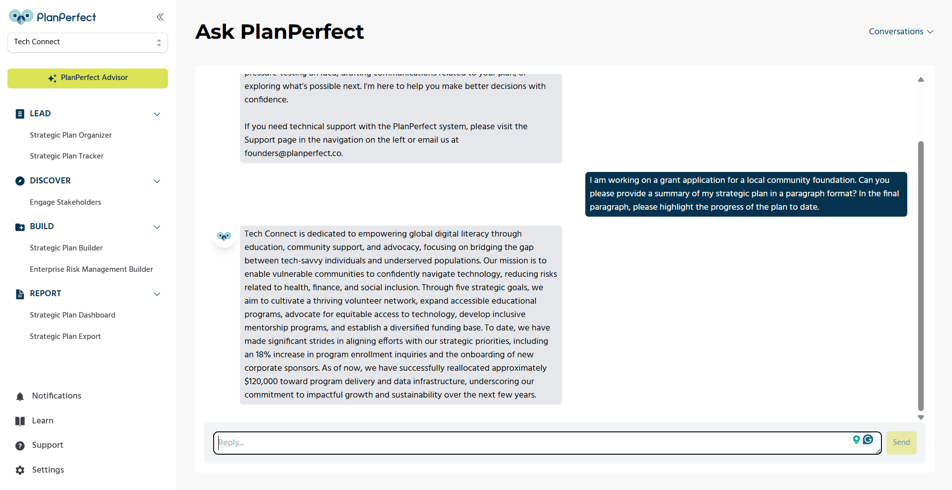 Effective planning requires an understanding of both past decisions and current conditions. But that information is often scattered across an organization's software platforms, electronic and paper documents, and people’s memories. PlanPerfect Advisor allows you to bring your organization’s information together in one place and uses it to power the PlanPerfect Advisor that understands your organization.