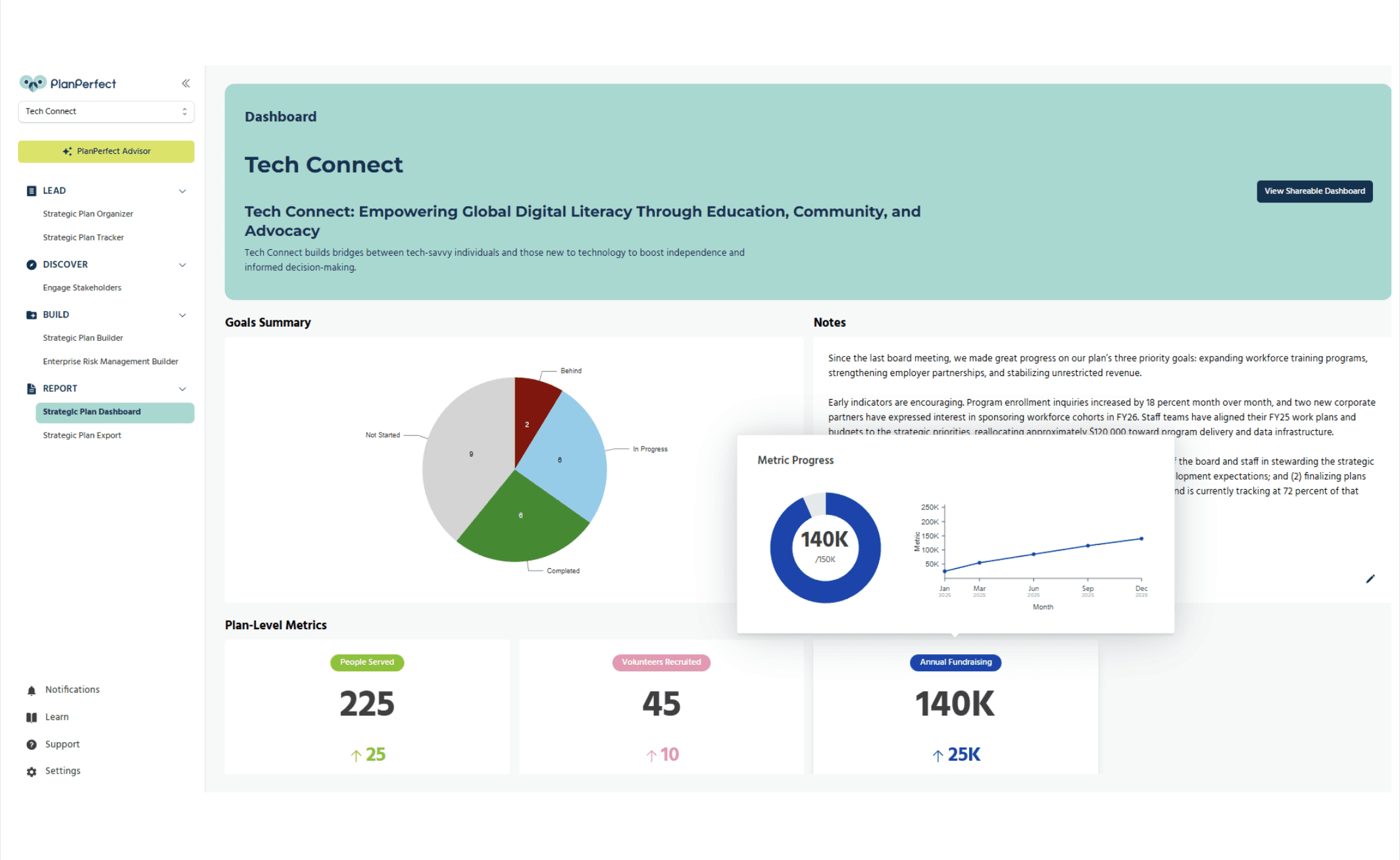 PlanPerfect is designed to empower small to mid-sized nonprofit organizations. A growing client base around the world—including Igiugig Village Council (Alaska), Dare2Tri (Illinois), and Immokalee Fair Housing Alliance (Florida)—are already using these features to align teams, strengthen governance, and move their missions forward.